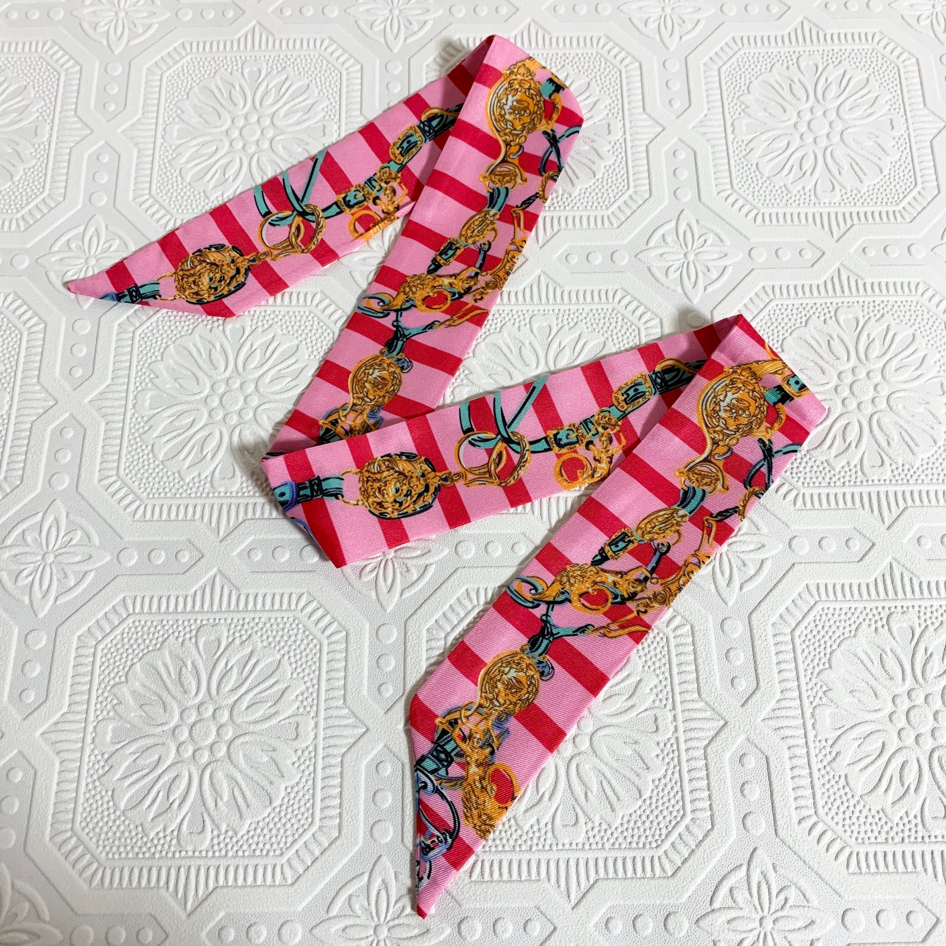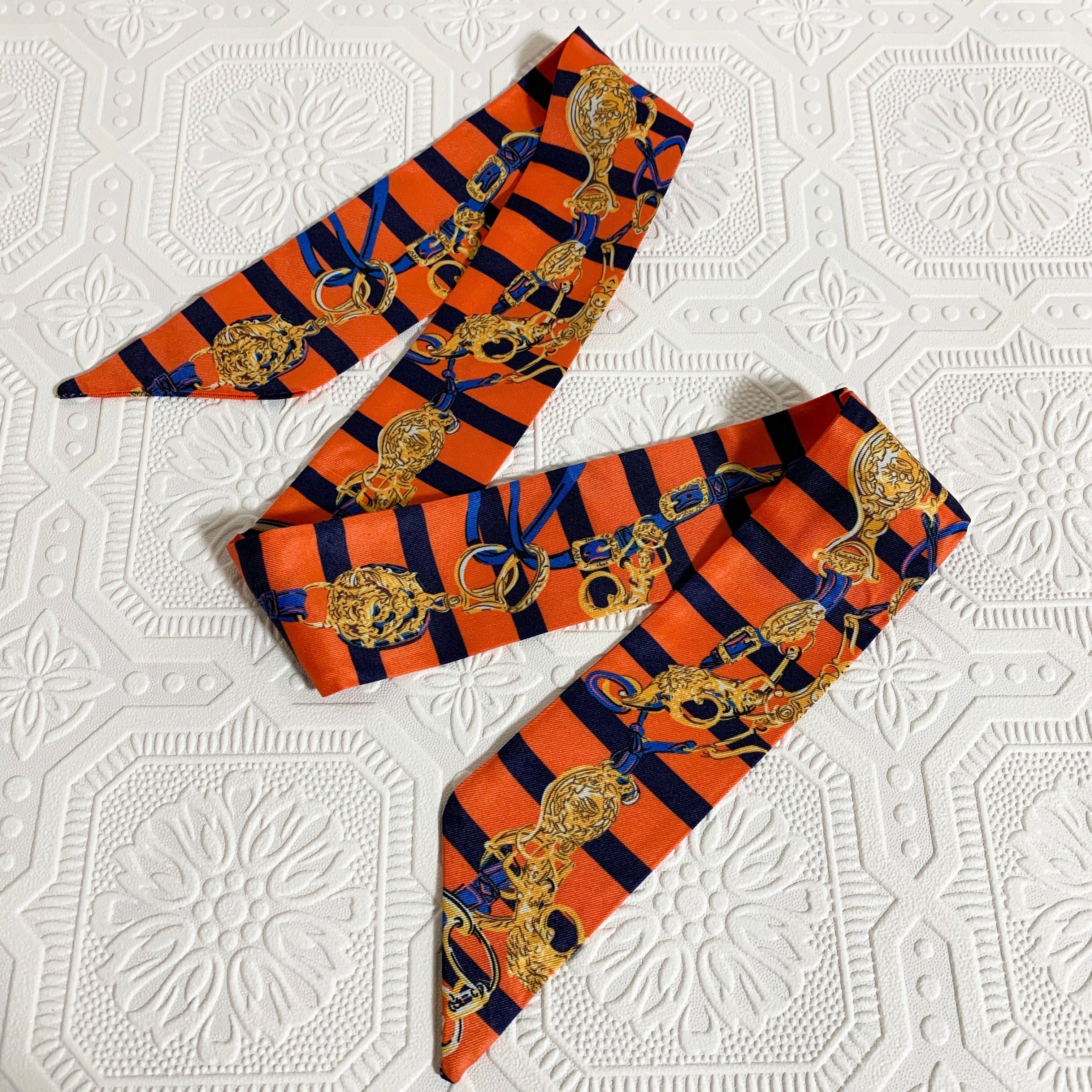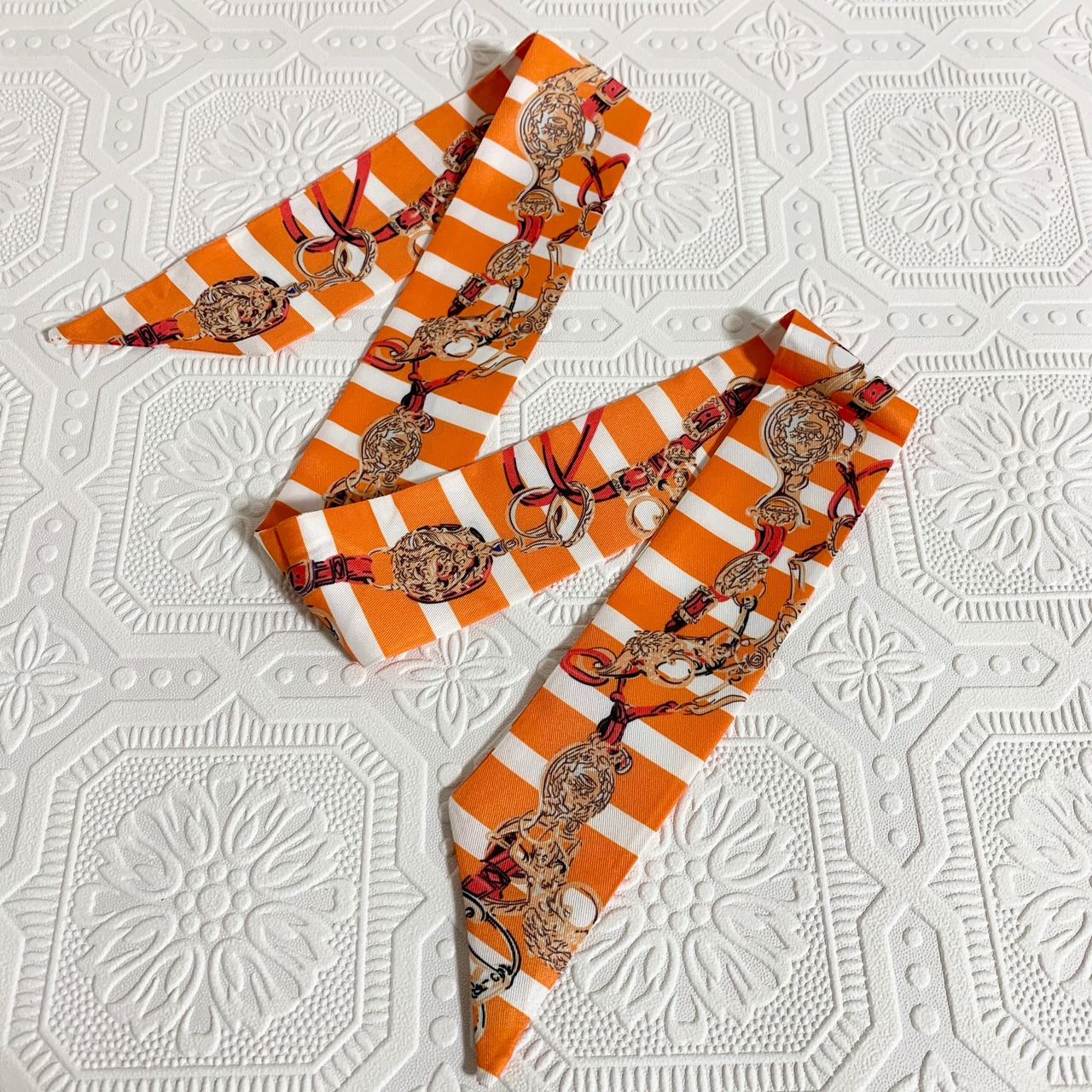 又、首元や腕に巻いたり、2枚繋げてベルトにしたり、ヘアーや帽子のアクセサリーとして、いつものコーデのワンポイントに大活躍のスカーフです。