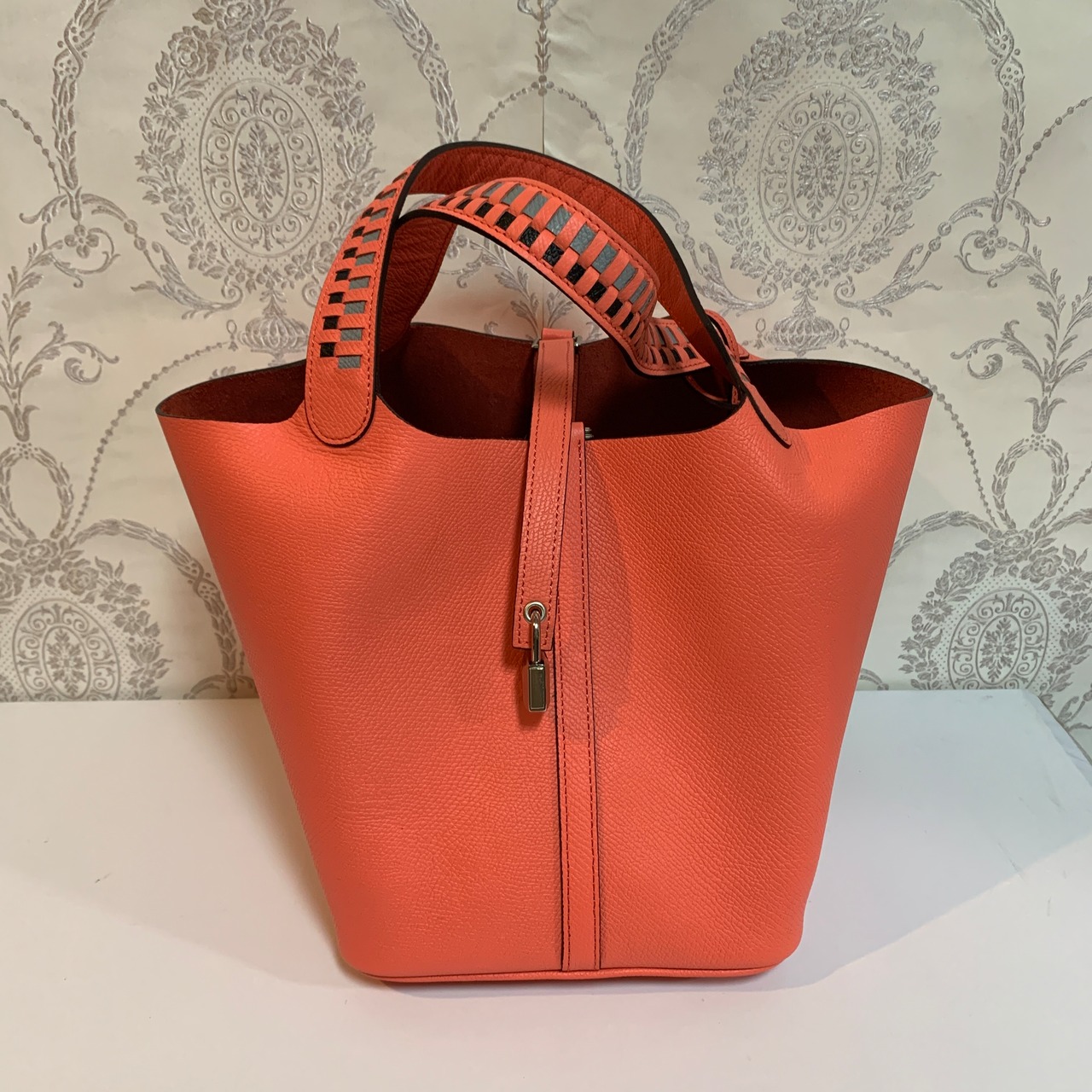 ハンドル柄 牛本革 キューブバッグ シルバー金具 M サーモンピンク